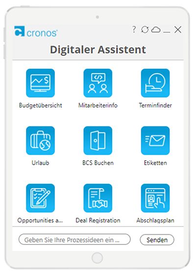 Wir bei cronos stehen hinter unseren Lösungen und setzen eine Vielzahl unserer Produkte und Services selbst ein, bevor wir sie unseren Kunden anbieten. Deshalb ist der digitale Assistent bei uns bereits seit über einem Jahr im Einsatz und praxiserprobt.