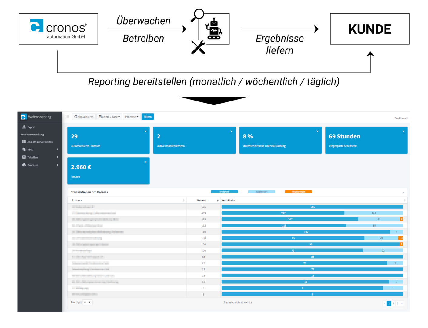 Im Rahmen des cronos-Supports haben Sie auch Zugang zu unserem Webmonitoring-Tool. Damit können Sie die Auslastung Ihrer Lizenzen überwachen, automatisierte Prozesse analysieren und monetäre Aspekte Ihrer automatisierten Geschäftsprozesse betrachten. Wir glauben, dass es wichtig ist, Ihnen einen umfassenden Einblick in Ihre laufenden Geschäftsprozesse zu geben, damit Sie die bestmöglichen Ergebnisse durch eine Bedarfsanalyse erzielen können.