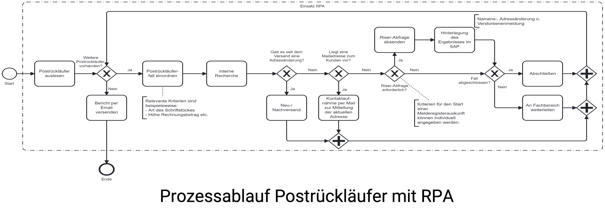 - Höhere Prozesssicherheit: Präzise Steuerung von Abbrüchen und Bearbeitung von Postrückläufern gemäß definierten Kriterien