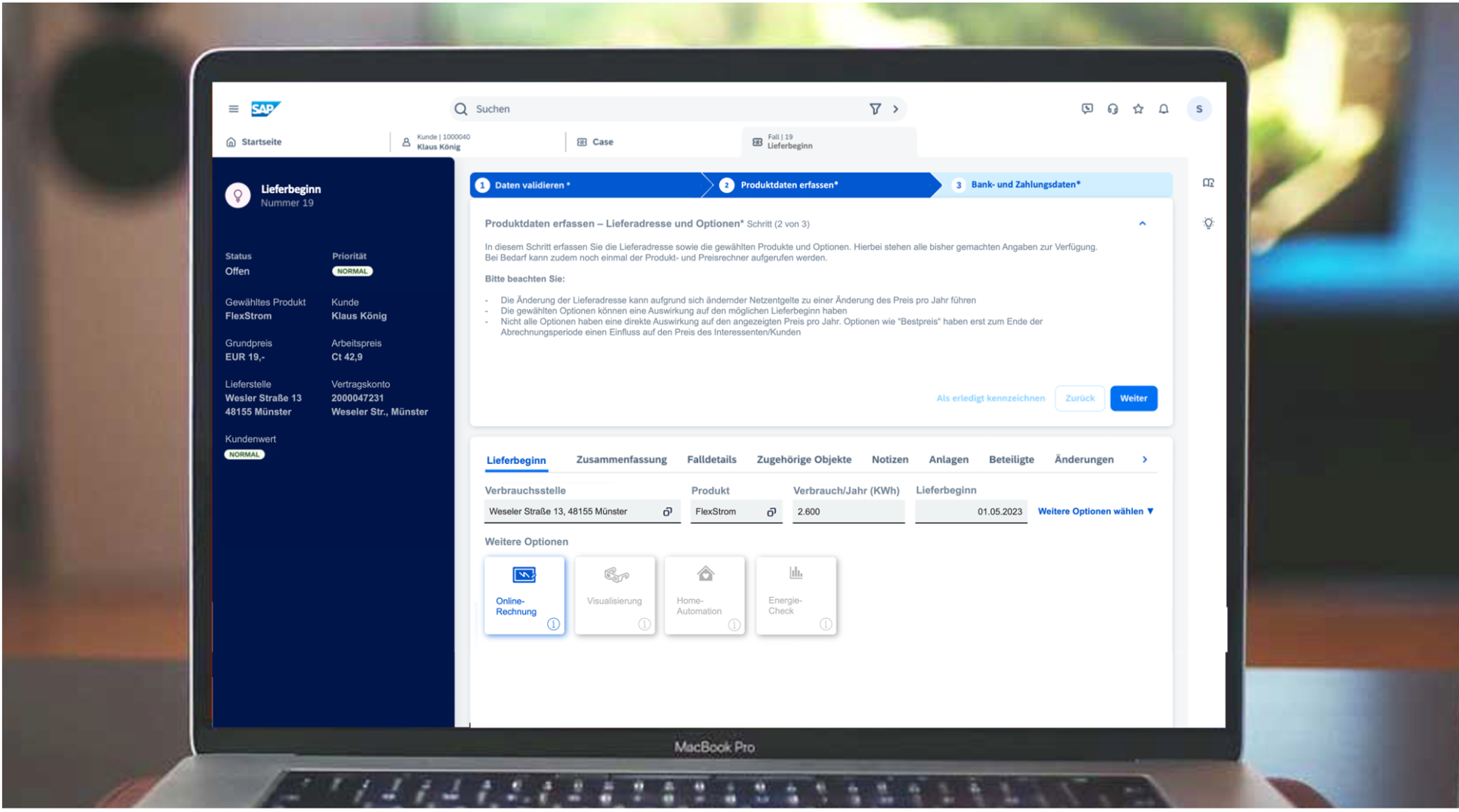 Utiltiy Produkte: Die B2C Vertragsprozess Lieferbeginn, Lieferende und Produktwechsel werden klickoptimiert für den Kunden ausgeprägt. Die Anzahl der Prozessschritt, die darzustellenden und einzugebenden Daten werden je Prozessschritt individuell eingerichtet